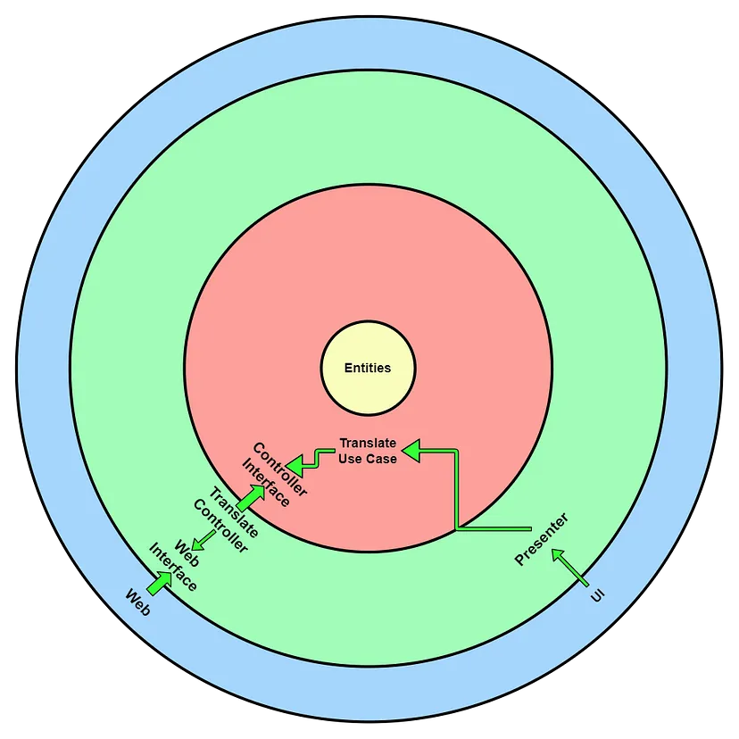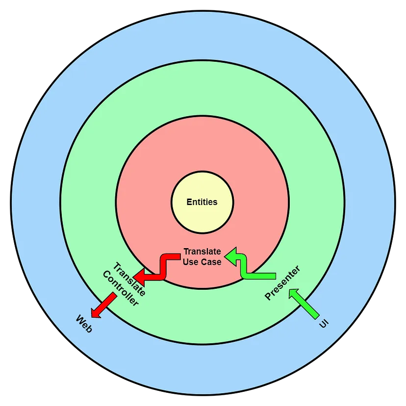 이 말은 가장 안쪽에 있는 레이어는 다른 레이어에 대해서 아무것도 알면 안 됩니다. 즉 안쪽에 있는 레이어는 밖에 있는 다른 레이어에 의존하면 안 됩니다. 그림에서 검은색 화살표가 종속성 규칙이 어떻게 적용되어 있는 보여줍니다.