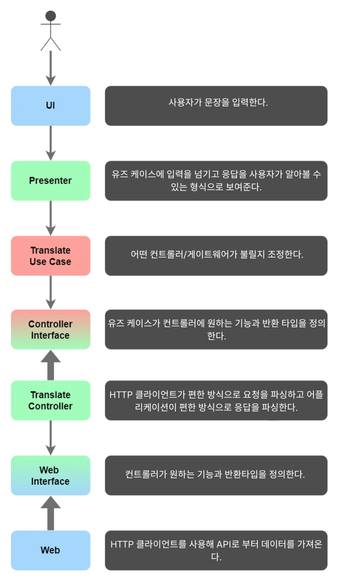 데이터 요청 흐름을 본다면 이렇게 돼야 한다. UI -> 프레젠터 -> 유즈 케이스 -> 컨트롤러 -> 웹